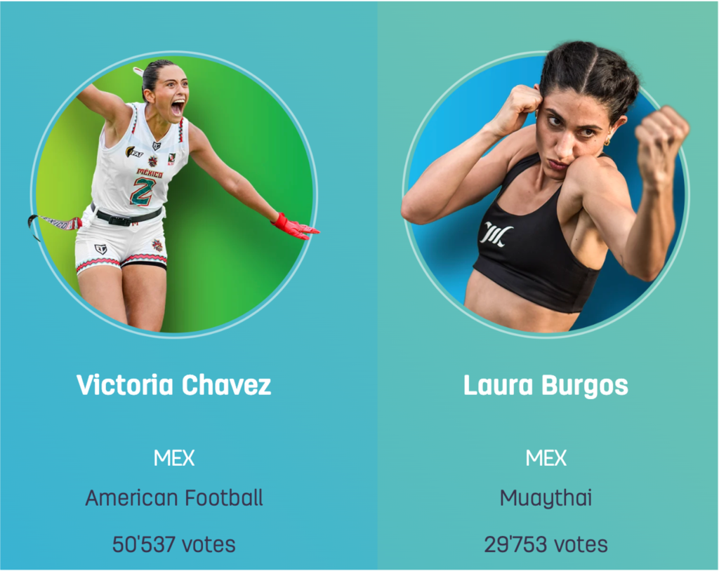Victoria Chávez, jugadora de la selección nacional de flag football y Laura Burgos, luchadora mexicana de Muay Thai, obtuvieron el primer y tercer lugar, respectivamente, como Atletas del Año 2025 de The World Games.